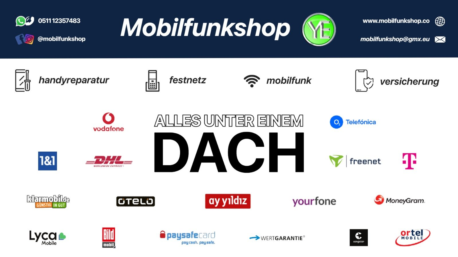 Telekom, 1und1, Vodafone , Ay yildiz , Blau.de, Talkline , Lifecell , O2, Otelo, Klarmobil und Congstar